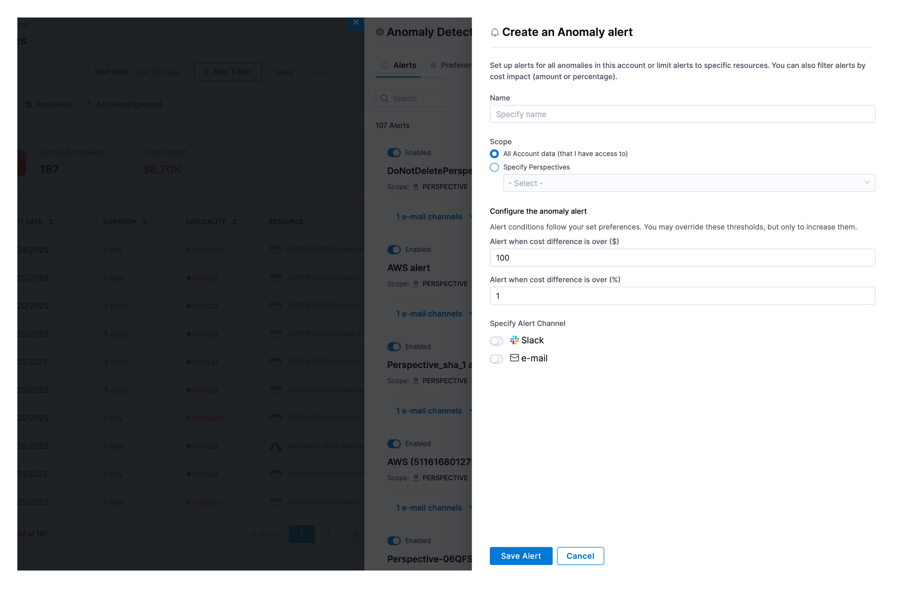 - Scope: Select all account data or specific perspectives for anomaly alerts.