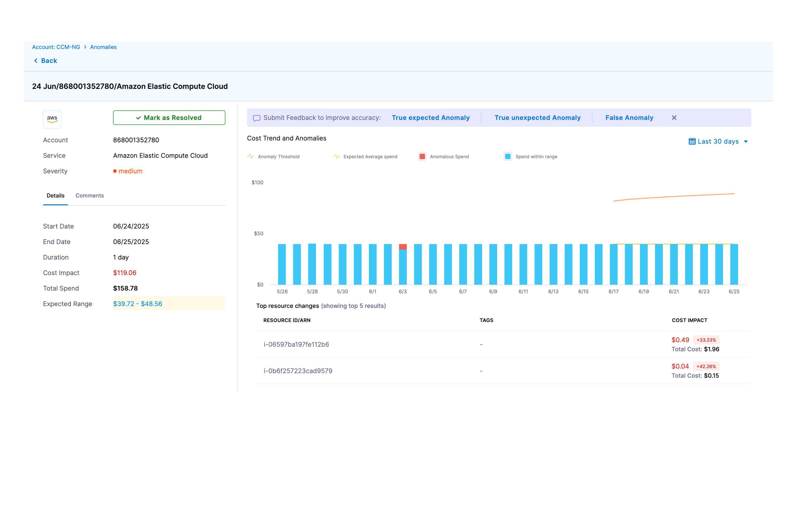 - Anomalous Spend: Costs that exceeded the normal threshold range