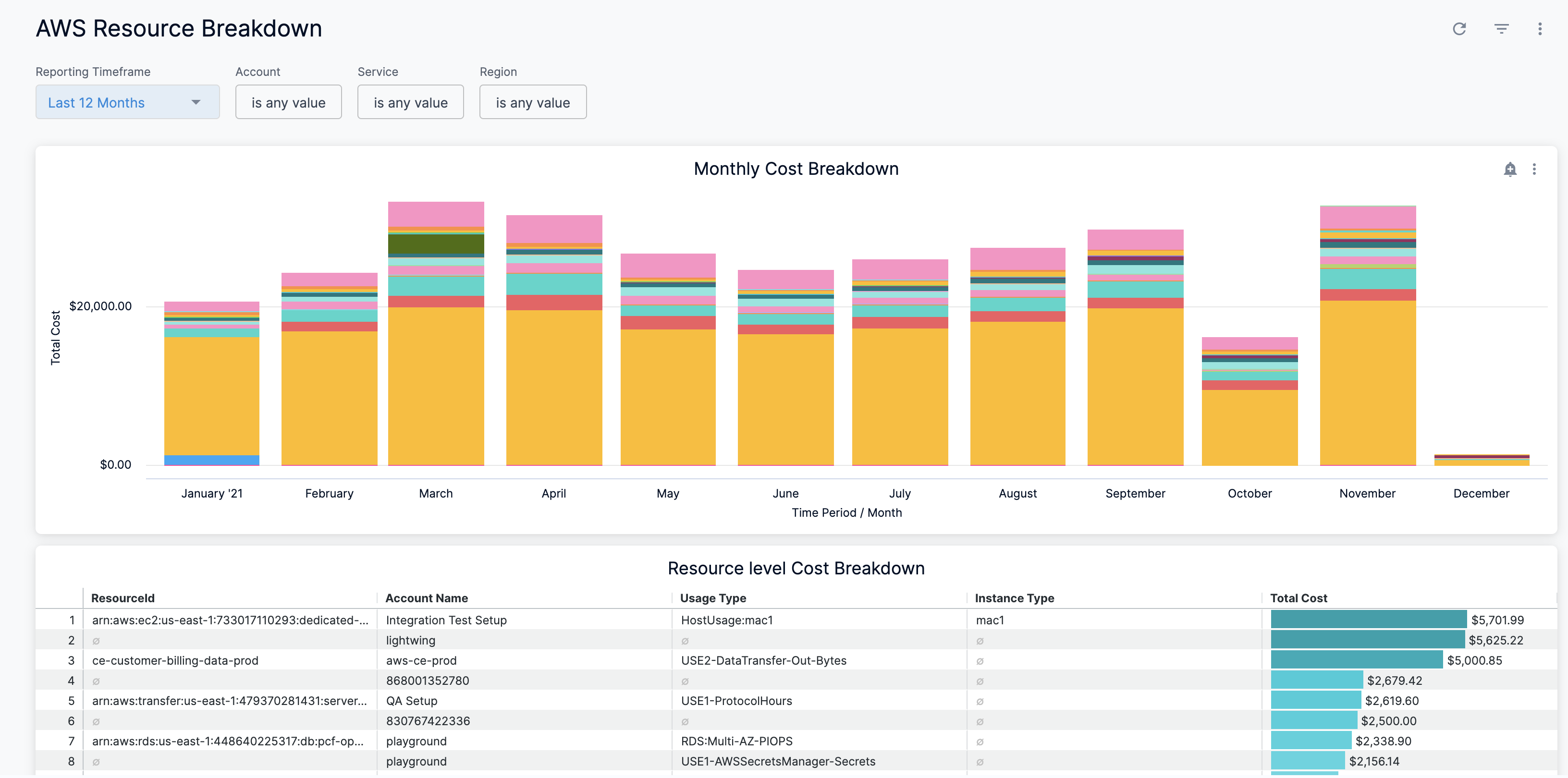 Harness provides preloaded By Harness (pre-defined) and Custom (user-defined) Dashboards to visualize cloud cost data across clusters and cloud accounts. Using the AWS Resource Breakdown Dashboard you can: