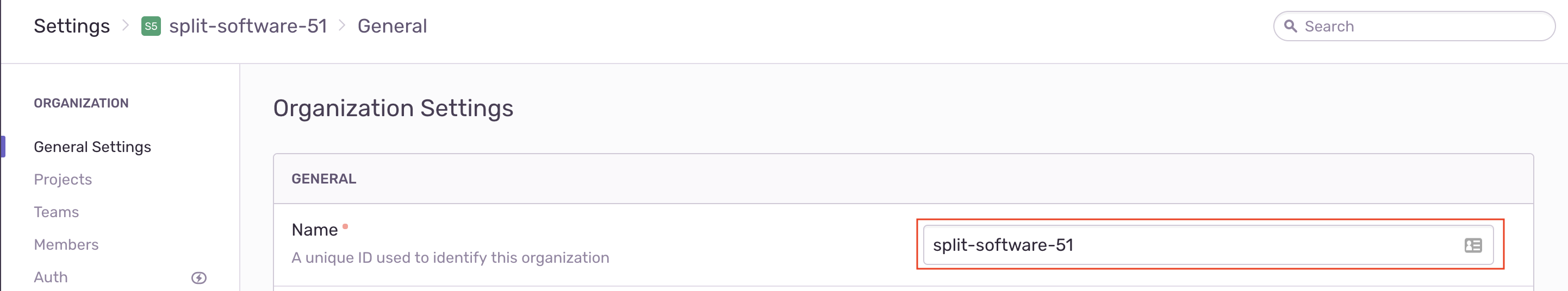 2. Copy your Sentry Organization Name. You can access this by clicking Settings in the left nav of your Sentry dashboard then clicking General Settings under the Organization section.