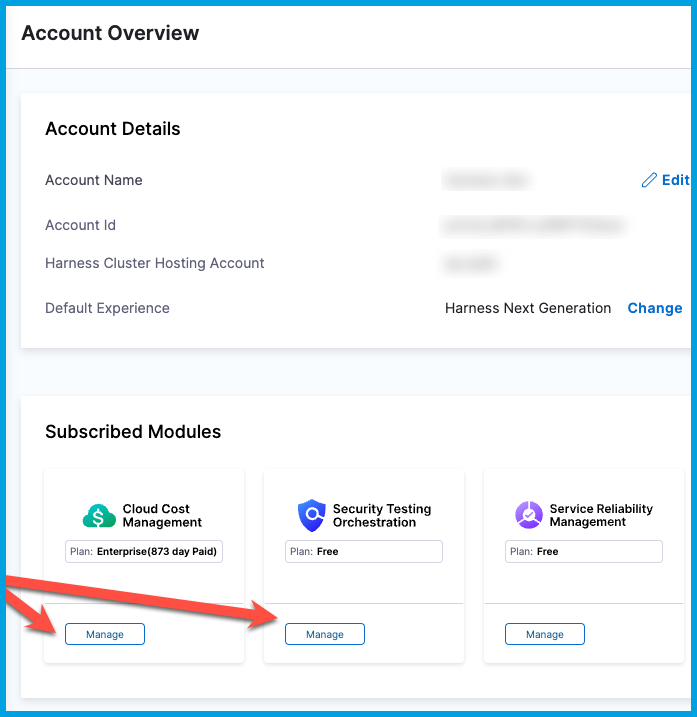 In your Harness account, go to Account Settings to view which Harness modules you are currently subscribed to. Subscriptions are shown in the Subscribed Modules section on the Overview page. You can select Manage to go to the Subscriptions page.
