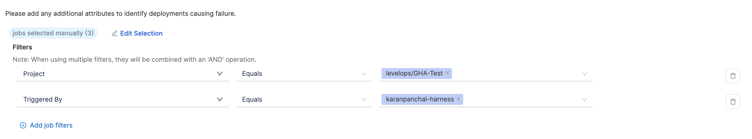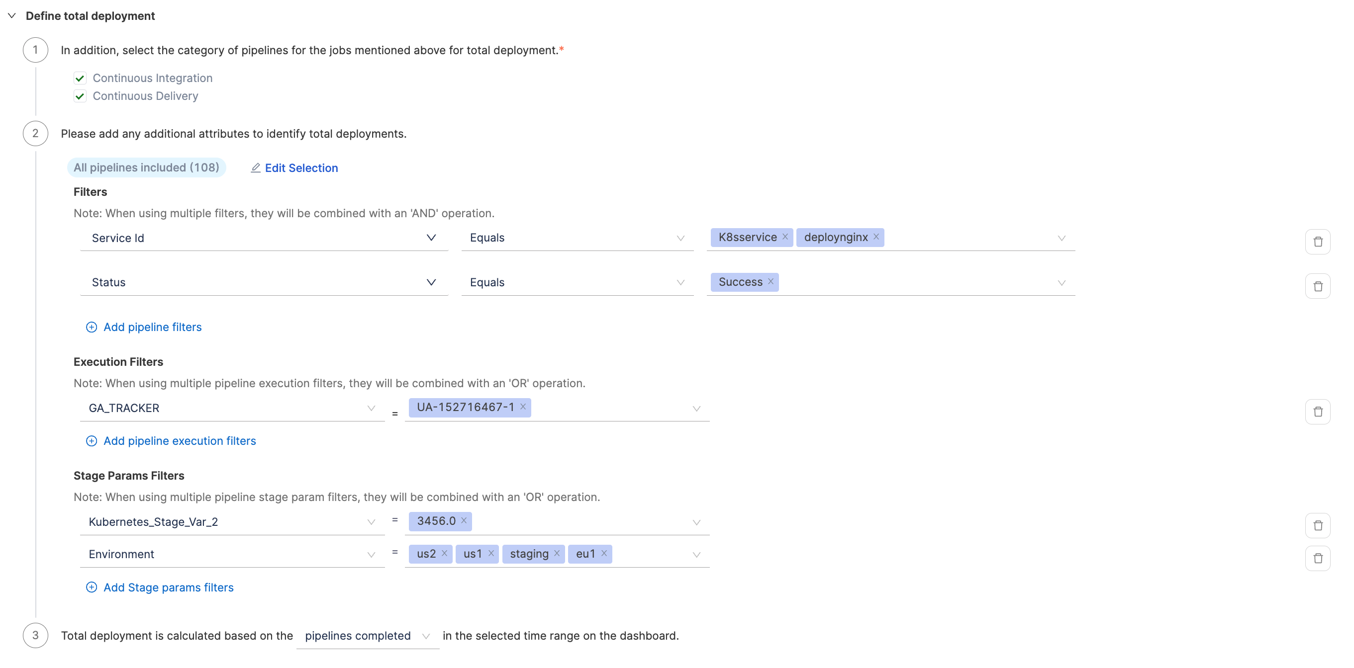 - Define additional attributes to identify deployments causing failure and total deployments. When using multiple filters, they will be combined with an 'AND' operation.