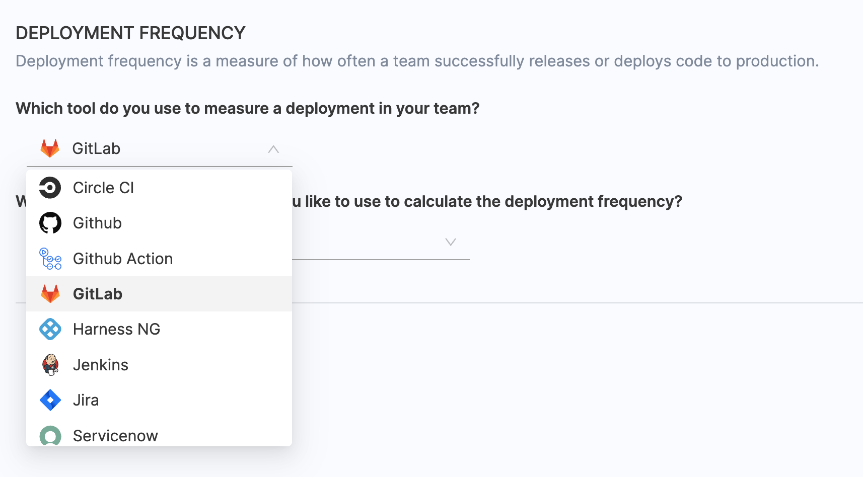 When the integration is configured with GitLab SCM, specify whether deployments causing failure and total deployments are defined based on Pull Requests (PR) or Commits.