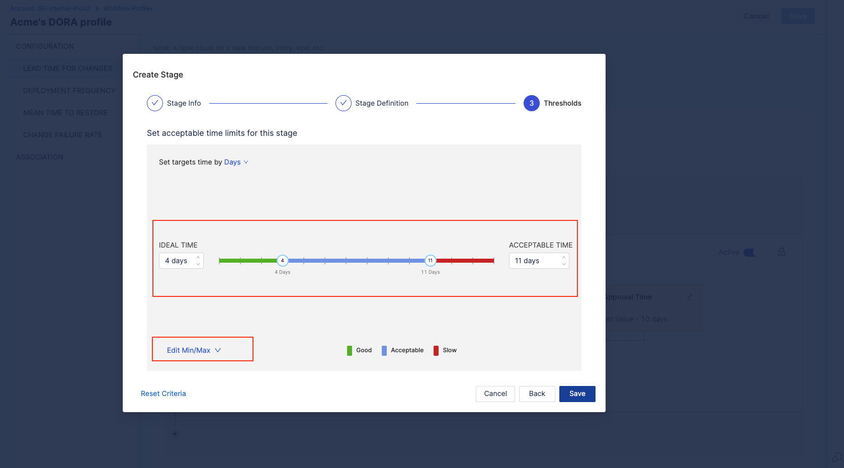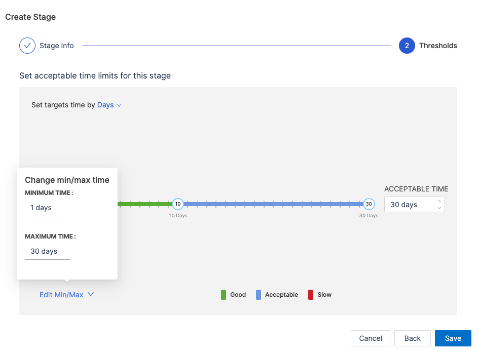 - Set acceptable time ranges for the stage, such as Ideal Time and Acceptable Time.