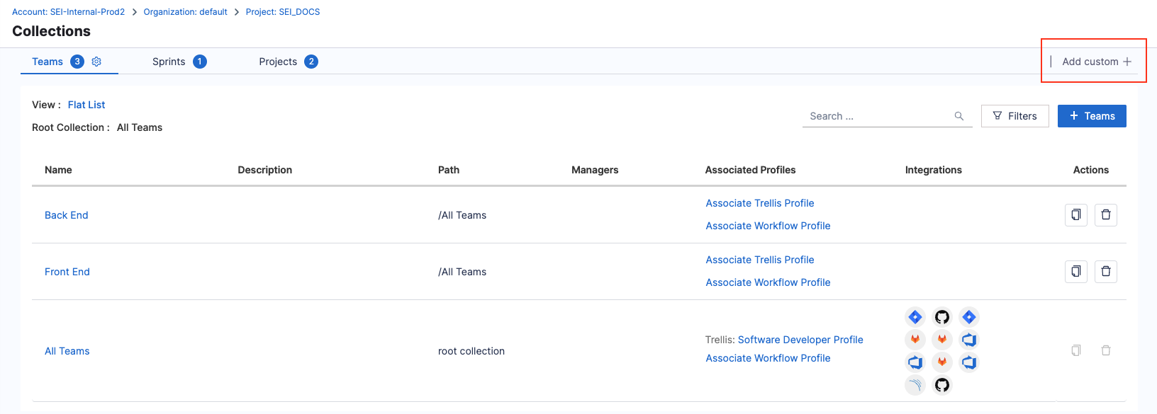 Each Harness project has two default Collection categories: Teams and Sprints. You can modify the default categories and create custom categories.