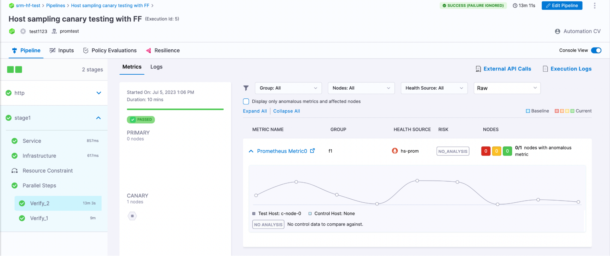 In the case where a metric is only being emitted by the canary pod, there will be no pre-deployment pods for that metric, and all the post-deployment pods will be canary pods. In this case, the Verification system will recognise only the Canary pods and no Primary pods. The Canary pod data will be collected (test-data) but since there is no Primary pod data (control-data), it will not be analysed and the overall analysis result for that metric will be No Analysis. By default, the verification will pass for this metric.