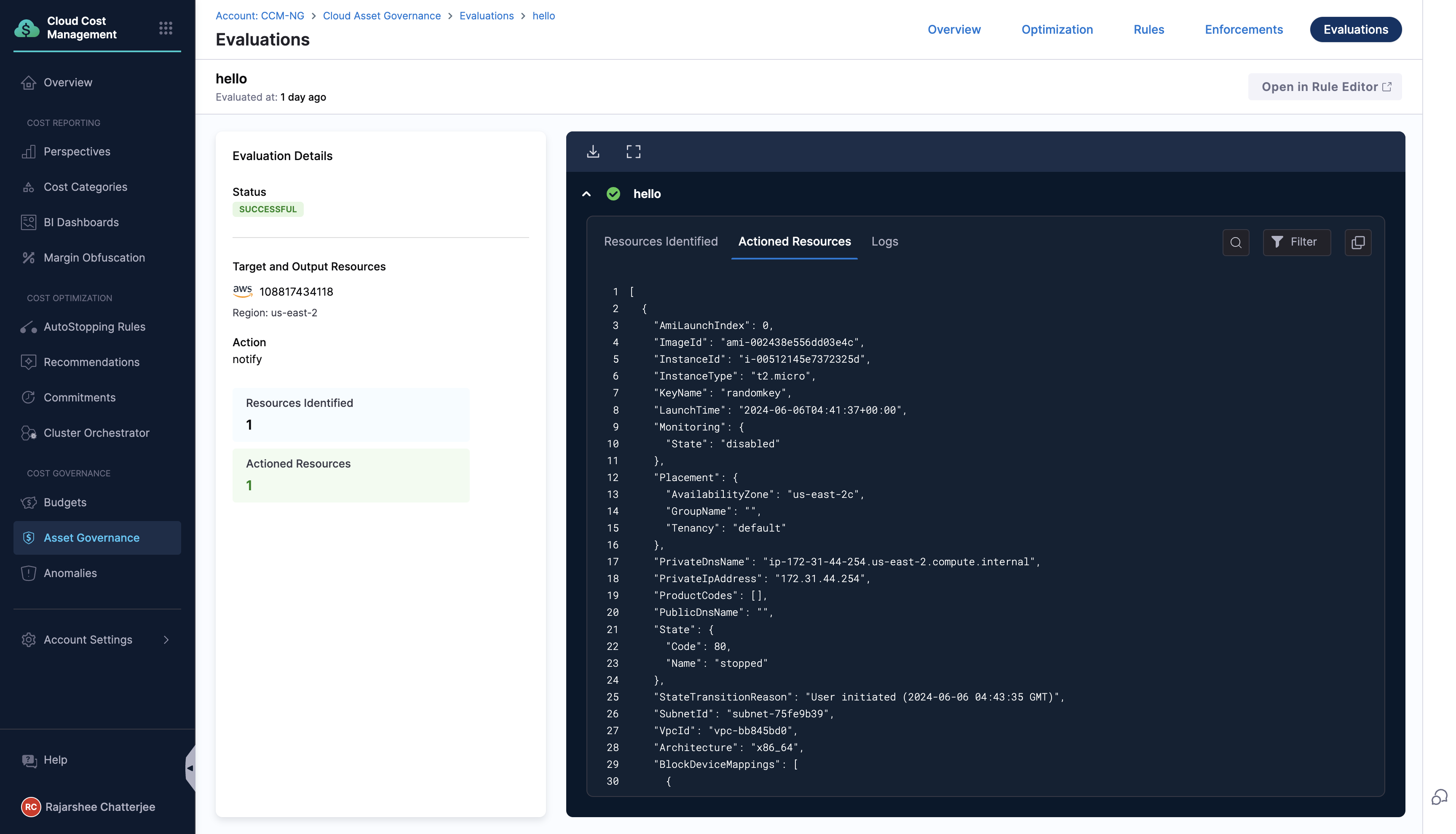 Enhanced Policy Evaluation Transparency We have added an Evaluated Rule tab in the Evaluation Output to display the policy YAML used for evaluation. An option "Include custodian-metadata.json" has been included in the bulk export functionality to export the metadata of the policies evaluated.