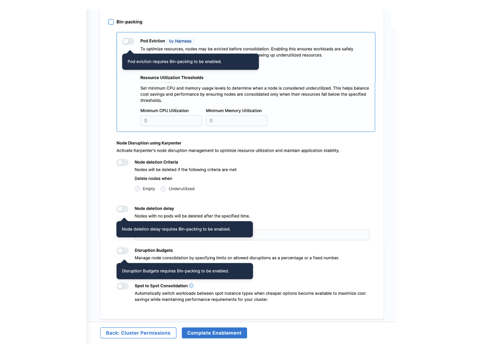 Bin Packing Notification Enhancement: If Bin Packing is disabled for a cluster within the Cluster Orchestrator, a notification banner and confirmation dialogue will appear upon saving, indicating that “Bin Packing must be enabled for cluster scale-down and optimal node utilisation.” [CCM-25324]