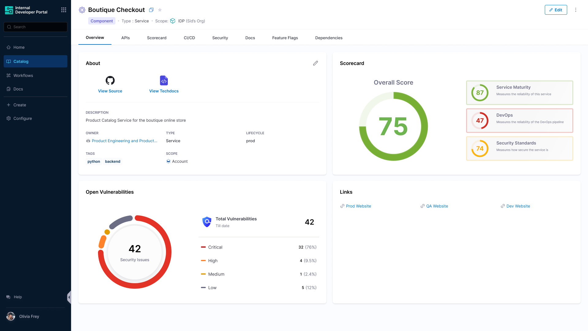 STO findings can now feed into IDP Scorecards, allowing automated tracking of security compliance across all services. Custom vulnerability checks, thresholds, and severity filters can be configured to reflect organization-wide security posture.