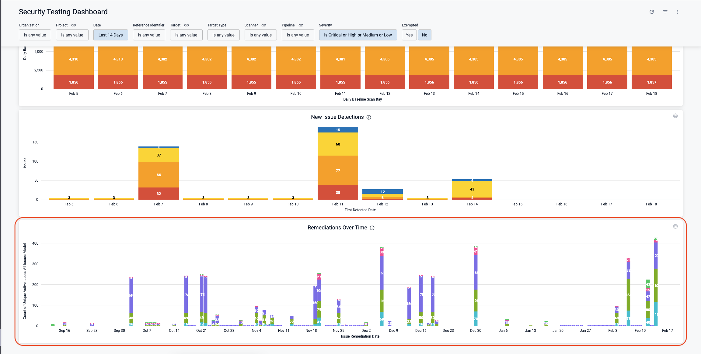 - STO Overview – The STO Overview provides a single, interactive view of all baseline issues detected by all scans in your project. A time series chart shows the daily distribution of issues by severity over the past 30 or 90 days. A daily snapshot shows the sum of all baseline issues based on the latest scan of each baseline. You can also drill down into active, failed, and in-progress baseline scans. (STO-3629)